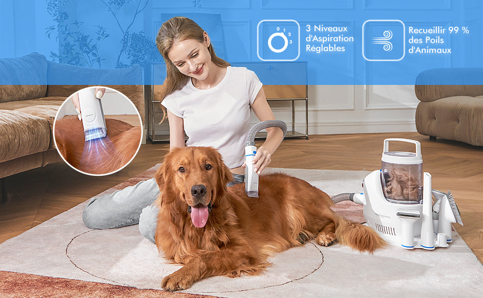 Le bruit de l'aspirateur est réduit à 52dB en mode éco, offrant une expérience de toilettage plus calme et agréable pour votre animal.